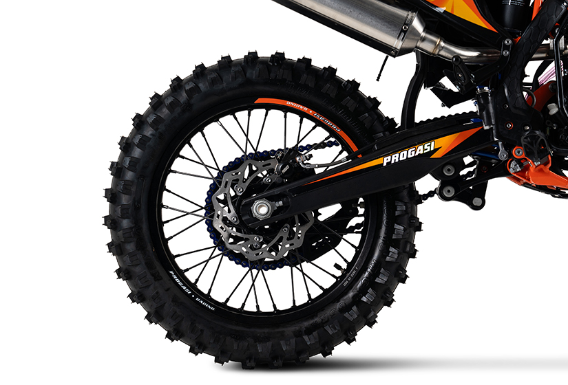 Brakes are the most important component of the motorcycle, on which the safety of the rider directly depends, as well as the speed of cornering. All PROGASI models have additional expansion tanks and reinforced brake hoses for flawless results. A two-piston brake system is installed in front and a one-piston brake system is installed in the back. The motorcycle proved can be stopped at any speed.